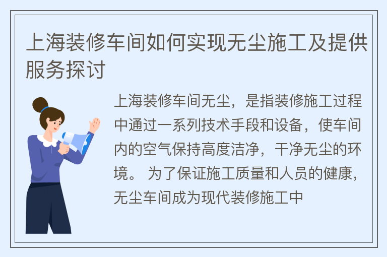 上海装修车间无尘,是指装修施工过程中通过一系列技术手段和设备,使车间内的空气保持高度洁净,干净无尘的环境。 为了保证施工质量和人员的健康,无尘车间成为现代装修施工中......【点击详情】