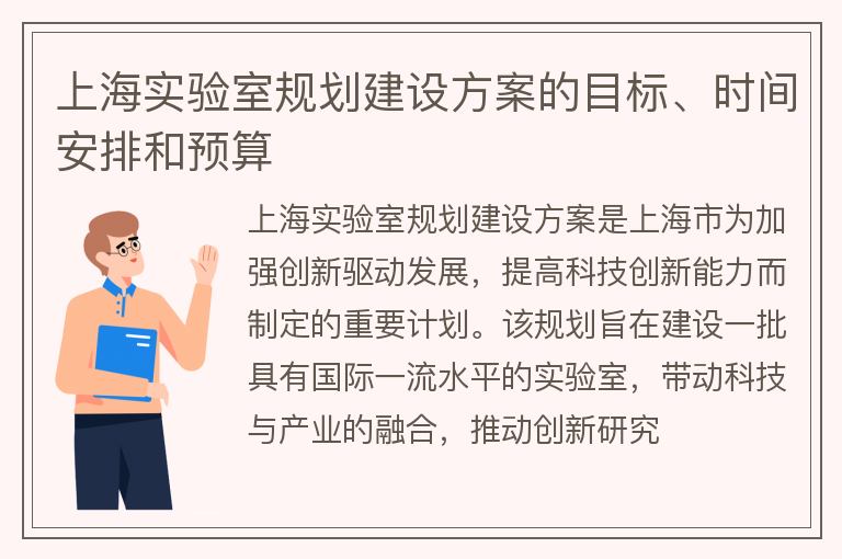 上海实验室规划建设方案是上海市为加强创新驱动发展,提高科技创新能力而制定的重要计划。该规划旨在建设一批具有国际一流水平的实验室,带动科技与产业的融合,推动创新研究......【点击详情】