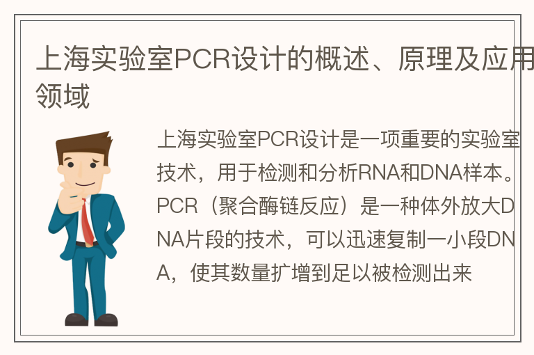 上海实验室PCR设计是一项重要的实验室技术,用于检测和分析RNA和DNA样本。PCR(聚合酶链反应)是一种体外放大DNA片段的技术,可以迅速复制一小段DNA,使其数量扩增到足以被检测出来......【点击详情】