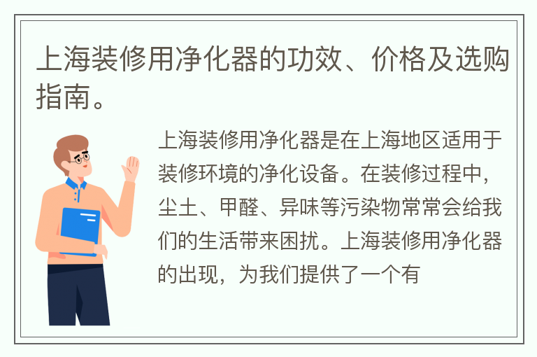 上海装修用净化器是在上海地区适用于装修环境的净化设备。在装修过程中,尘土、甲醛、异味等污染物常常会给我们的生活带来困扰。上海装修用净化器的出现,为我们提供了一个有......【点击详情】