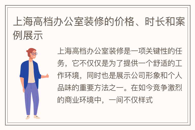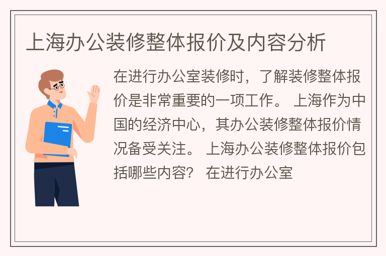 在进行办公室装修时,了解装修整体报价是非常重要的一项工作。 上海作为中国的经济中心,其办公装修整体报价情况备受关注。 上海办公装修整体报价包括哪些内容? 在进行办公室......【点击详情】
