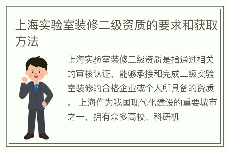 上海实验室装修二级资质是指通过相关的审核认证,能够承接和完成二级实验室装修的合格企业或个人所具备的资质。 上海作为我国现代化建设的重要城市之一,拥有众多高校、科研机......【点击详情】