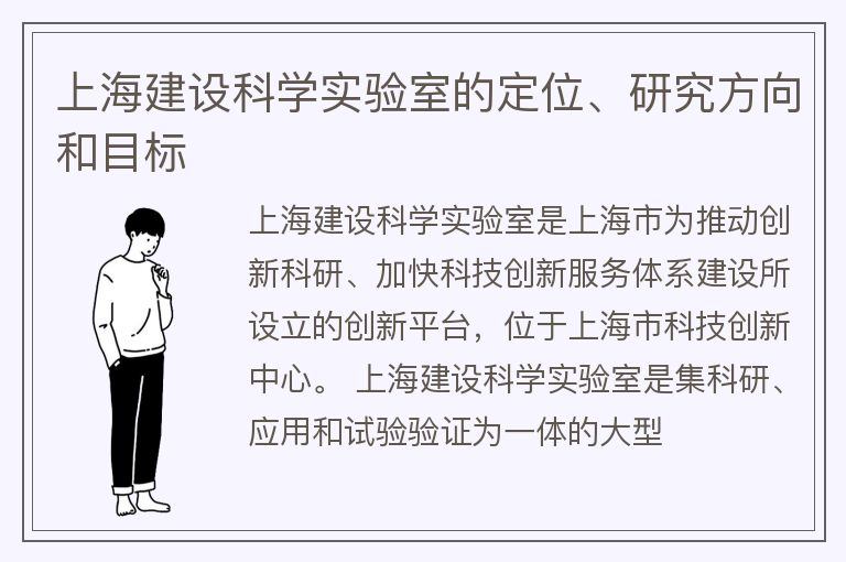 上海建设科学实验室是上海市为推动创新科研、加快科技创新服务体系建设所设立的创新平台,位于上海市科技创新中心。 上海建设科学实验室是集科研、应用和试验验证为一体的大型......【点击详情】