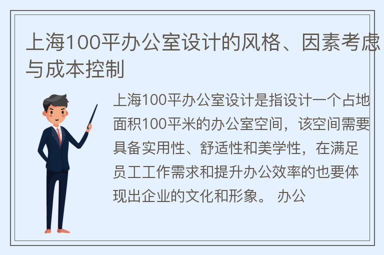 上海100平办公室设计是指设计一个占地面积100平米的办公室空间,该空间需要具备实用性、舒适性和美学性,在满足员工工作需求和提升办公效率的也要体现出企业的文化和形象。 办公......【点击详情】