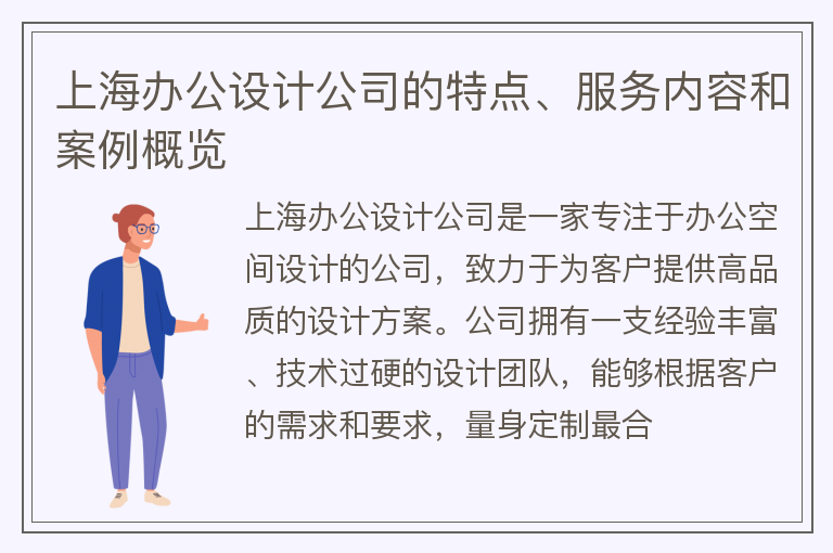 上海办公设计公司是一家专注于办公空间设计的公司,致力于为客户提供高品质的设计方案。公司拥有一支经验丰富、技术过硬的设计团队,能够根据客户的需求和要求,量身定制最合......【点击详情】