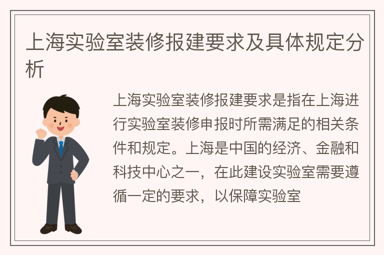 上海实验室装修报建要求是指在上海进行实验室装修申报时所需满足的相关条件和规定。上海是中国的经济、金融和科技中心之一,在此建设实验室需要遵循一定的要求,以保障实验室......【点击详情】