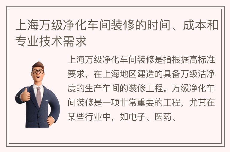 上海万级净化车间装修是指根据高标准要求,在上海地区建造的具备万级洁净度的生产车间的装修工程。万级净化车间装修是一项非常重要的工程,尤其在某些行业中,如电子、医药、......【点击详情】