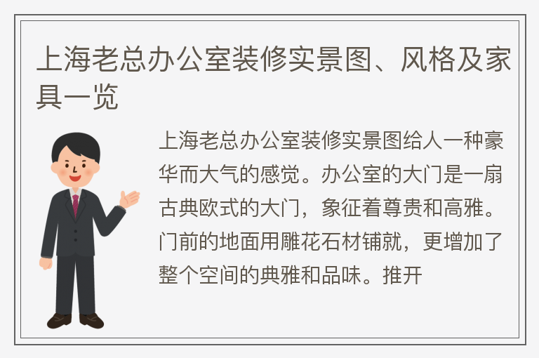 上海老总办公室装修实景图给人一种豪华而大气的感觉。办公室的大门是一扇古典欧式的大门,象征着尊贵和高雅。门前的地面用雕花石材铺就,更增加了整个空间的典雅和品味。推开......【点击详情】