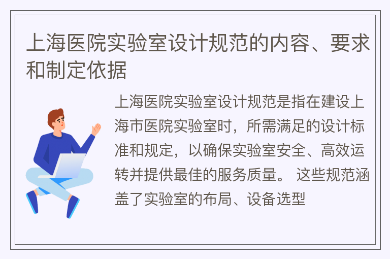 上海医院实验室设计规范是指在建设上海市医院实验室时,所需满足的设计标准和规定,以确保实验室安全、高效运转并提供最佳的服务质量。 这些规范涵盖了实验室的布局、设备选型......【点击详情】
