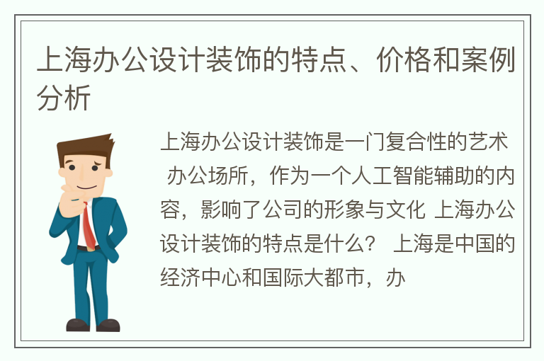 上海办公设计装饰是一门复合性的艺术 办公场所,作为一个人工智能辅助的内容,影响了公司的形象与文化 上海办公设计装饰的特点是什么? 上海是中国的经济中心和国际大都市,办......【点击详情】