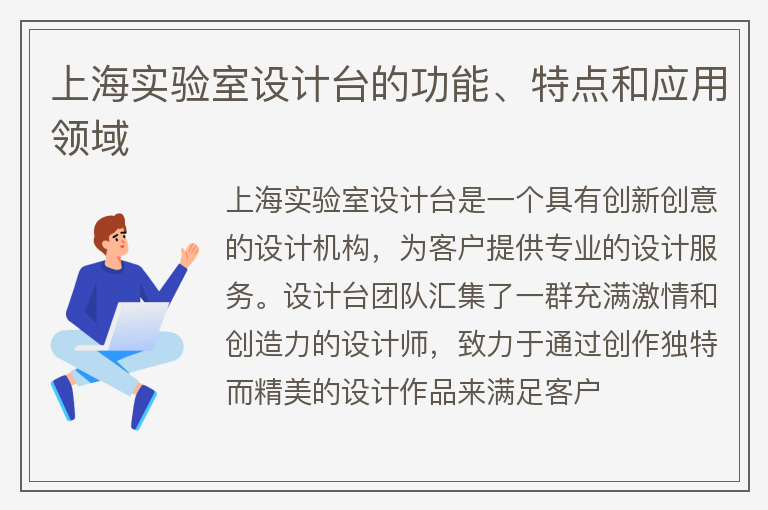 上海实验室设计台是一个具有创新创意的设计机构,为客户提供专业的设计服务。设计台团队汇集了一群充满激情和创造力的设计师,致力于通过创作独特而精美的设计作品来满足客户......【点击详情】