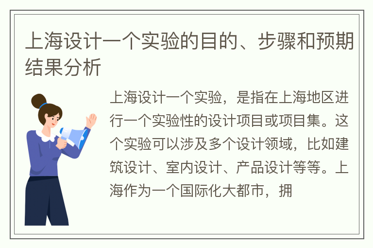 上海设计一个实验,是指在上海地区进行一个实验性的设计项目或项目集。这个实验可以涉及多个设计领域,比如建筑设计、室内设计、产品设计等等。上海作为一个国际化大都市,拥......【点击详情】