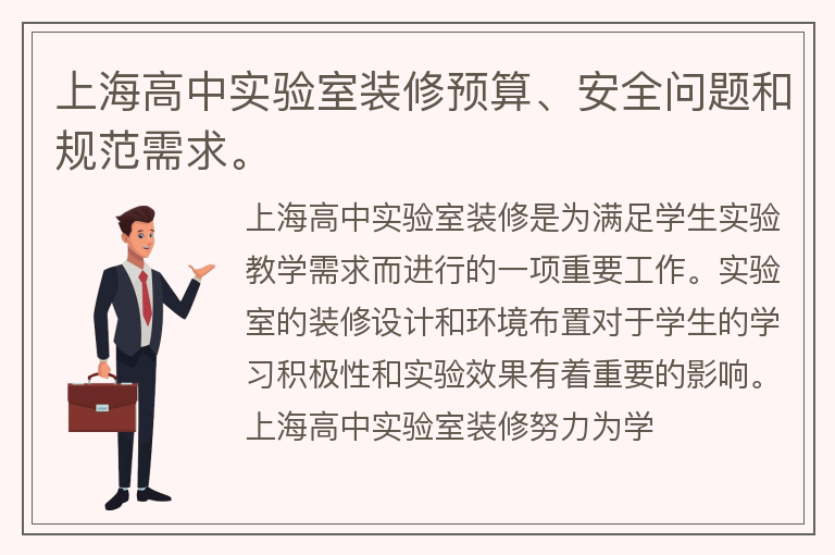 上海高中实验室装修是为满足学生实验教学需求而进行的一项重要工作。实验室的装修设计和环境布置对于学生的学习积极性和实验效果有着重要的影响。上海高中实验室装修努力为学......【点击详情】