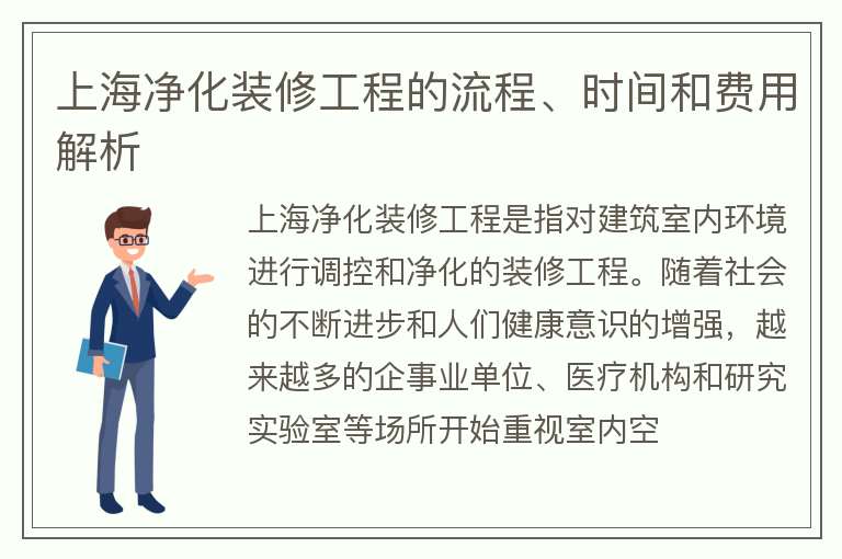 上海净化装修工程是指对建筑室内环境进行调控和净化的装修工程。随着社会的不断进步和人们健康意识的增强,越来越多的企事业单位、医疗机构和研究实验室等场所开始重视室内空......【点击详情】