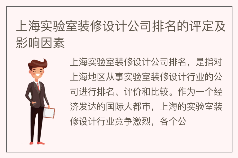 上海实验室装修设计公司排名,是指对上海地区从事实验室装修设计行业的公司进行排名、评价和比较。作为一个经济发达的国际大都市,上海的实验室装修设计行业竞争激烈,各个公......【点击详情】