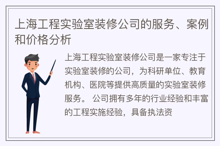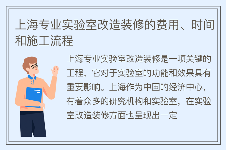 上海工程实验室装修公司是一家专注于实验室装修的公司,为科研单位、教育机构、医院等提供高质量的实验室装修服务。 公司拥有多年的行业经验和丰富的工程实施经验,具备执法资......【点击详情】