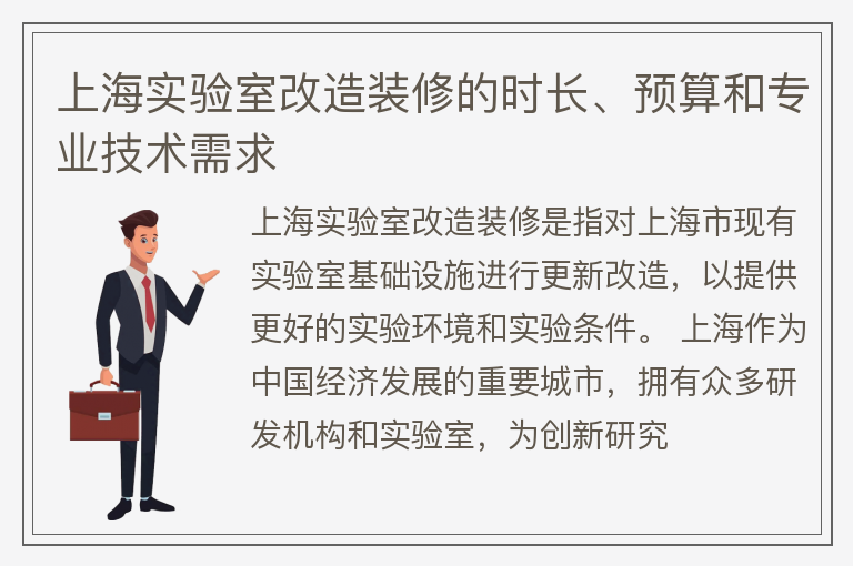 上海专业实验室改造装修是一项关键的工程,它对于实验室的功能和效果具有重要影响。上海作为中国的经济中心,有着众多的研究机构和实验室,在实验室改造装修方面也呈现出一定......【点击详情】