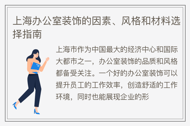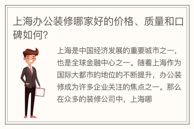 上海是中国经济发展的重要城市之一,也是全球金融中心之一。随着上海作为国际大都市的地位的不断提升,办公装修成为许多企业关注的焦点之一。那么在众多的装修公司中,上海哪......【点击详情】