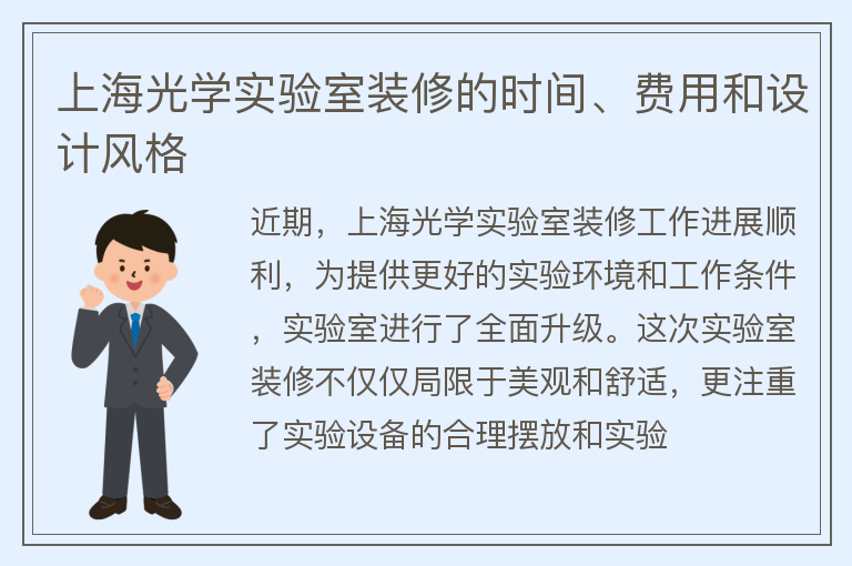 近期,上海光学实验室装修工作进展顺利,为提供更好的实验环境和工作条件,实验室进行了全面升级。这次实验室装修不仅仅局限于美观和舒适,更注重了实验设备的合理摆放和实验......【点击详情】