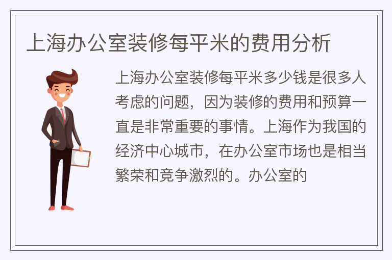 上海办公室装修每平米多少钱是很多人考虑的问题,因为装修的费用和预算一直是非常重要的事情。上海作为我国的经济中心城市,在办公室市场也是相当繁荣和竞争激烈的。办公室的......【点击详情】