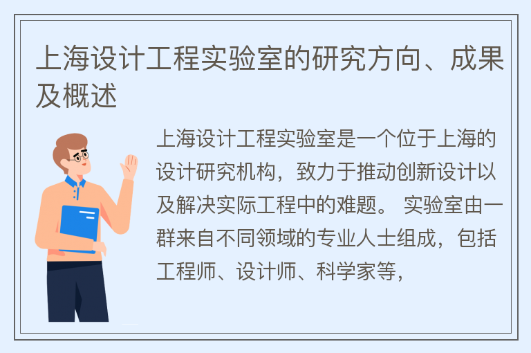 上海设计工程实验室是一个位于上海的设计研究机构,致力于推动创新设计以及解决实际工程中的难题。 实验室由一群来自不同领域的专业人士组成,包括工程师、设计师、科学家等,......【点击详情】