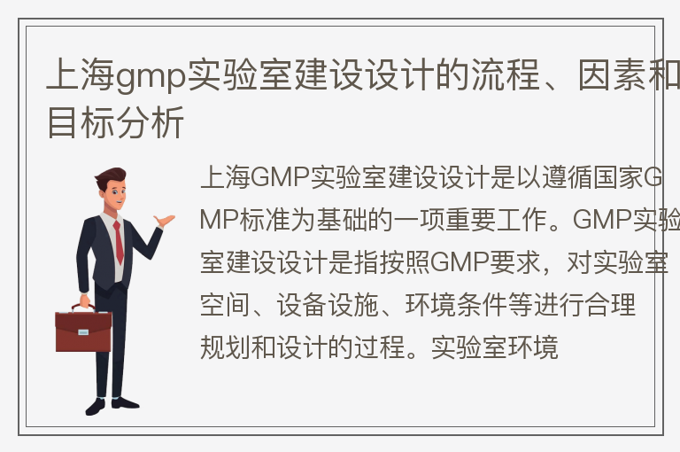 上海GMP实验室建设设计是以遵循国家GMP标准为基础的一项重要工作。GMP实验室建设设计是指按照GMP要求,对实验室空间、设备设施、环境条件等进行合理规划和设计的过程。实验室环境......【点击详情】