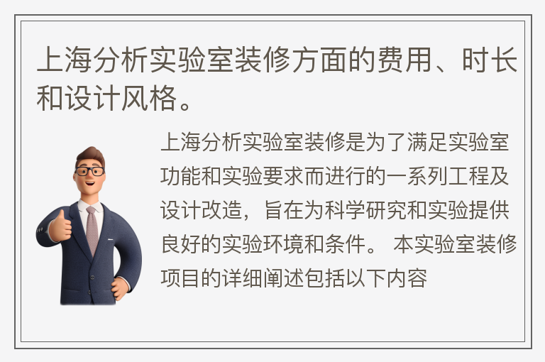 上海分析实验室装修是为了满足实验室功能和实验要求而进行的一系列工程及设计改造,旨在为科学研究和实验提供良好的实验环境和条件。 本实验室装修项目的详细阐述包括以下内容......【点击详情】