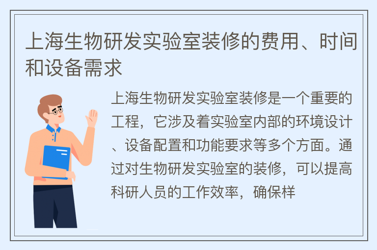 上海生物研发实验室装修是一个重要的工程,它涉及着实验室内部的环境设计、设备配置和功能要求等多个方面。通过对生物研发实验室的装修,可以提高科研人员的工作效率,确保样......【点击详情】