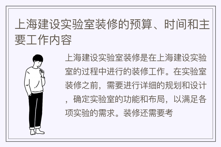 上海建设实验室装修是在上海建设实验室的过程中进行的装修工作。在实验室装修之前,需要进行详细的规划和设计,确定实验室的功能和布局,以满足各项实验的需求。装修还需要考......【点击详情】