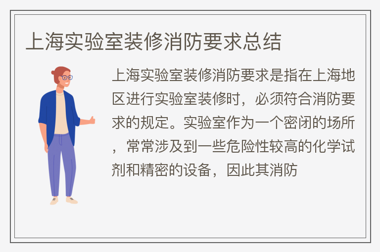 上海实验室装修消防要求是指在上海地区进行实验室装修时,必须符合消防要求的规定。实验室作为一个密闭的场所,常常涉及到一些危险性较高的化学试剂和精密的设备,因此其消防......【点击详情】