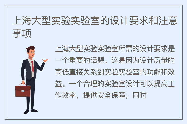 上海大型实验实验室所需的设计要求是一个重要的话题。这是因为设计质量的高低直接关系到实验实验室的功能和效益。一个合理的实验室设计可以提高工作效率,提供安全保障,同时......【点击详情】