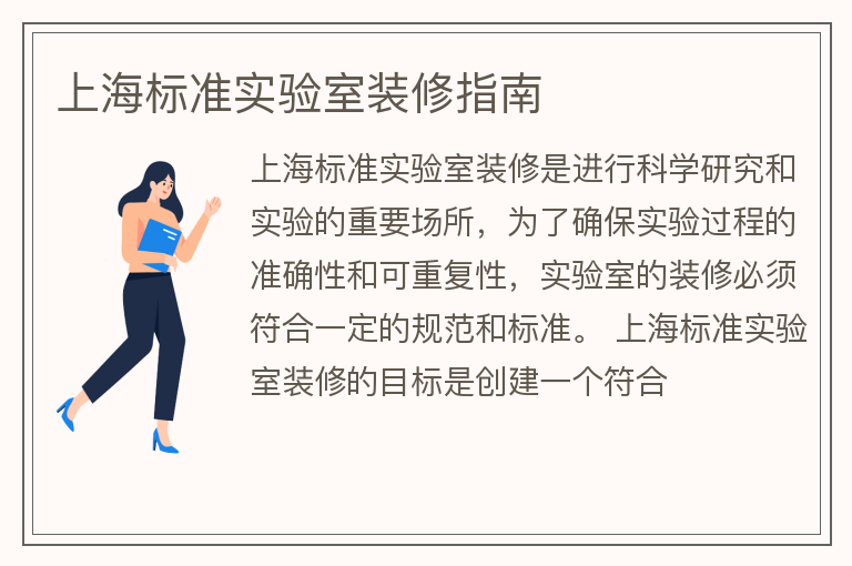 上海标准实验室装修是进行科学研究和实验的重要场所,为了确保实验过程的准确性和可重复性,实验室的装修必须符合一定的规范和标准。 上海标准实验室装修的目标是创建一个符合......【点击详情】