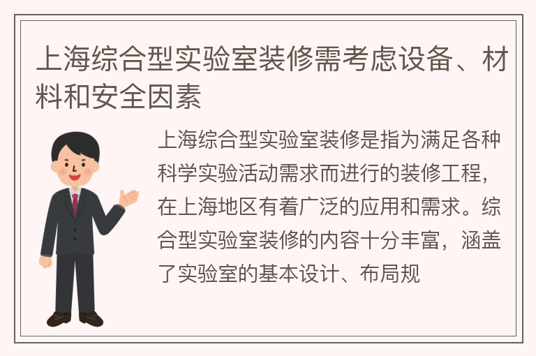 上海综合型实验室装修是指为满足各种科学实验活动需求而进行的装修工程,在上海地区有着广泛的应用和需求。综合型实验室装修的内容十分丰富,涵盖了实验室的基本设计、布局规......【点击详情】