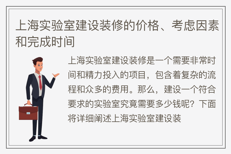 上海实验室建设装修是一个需要非常时间和精力投入的项目,包含着复杂的流程和众多的费用。那么,建设一个符合要求的实验室究竟需要多少钱呢?下面将详细阐述上海实验室建设装......【点击详情】