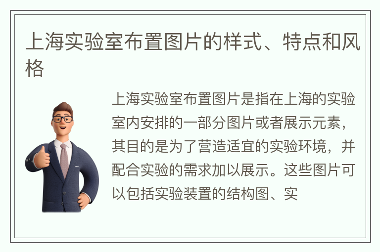 上海实验室布置图片是指在上海的实验室内安排的一部分图片或者展示元素,其目的是为了营造适宜的实验环境,并配合实验的需求加以展示。这些图片可以包括实验装置的结构图、实......【点击详情】