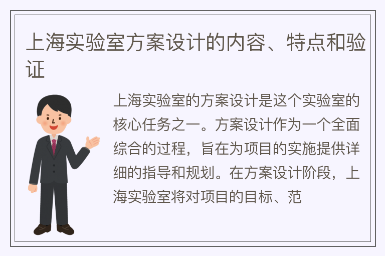 上海实验室的方案设计是这个实验室的核心任务之一。方案设计作为一个全面综合的过程,旨在为项目的实施提供详细的指导和规划。在方案设计阶段,上海实验室将对项目的目标、范......【点击详情】