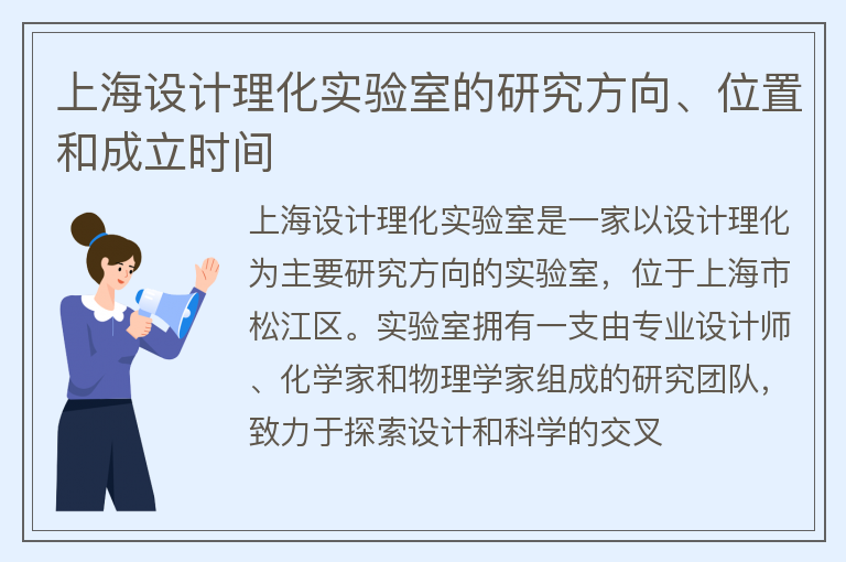上海设计理化实验室是一家以设计理化为主要研究方向的实验室,位于上海市松江区。实验室拥有一支由专业设计师、化学家和物理学家组成的研究团队,致力于探索设计和科学的交叉......【点击详情】