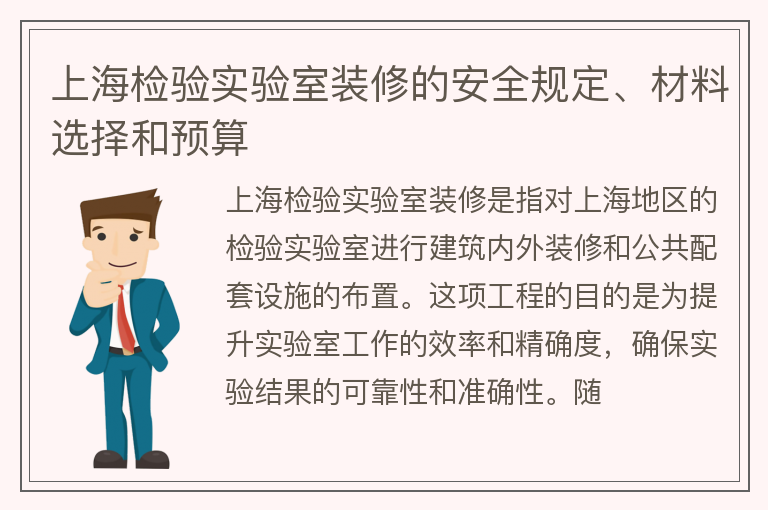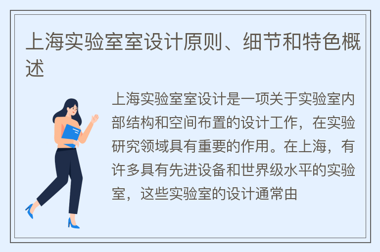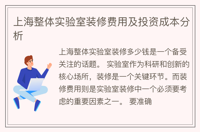 上海整体实验室装修多少钱是一个备受关注的话题。 实验室作为科研和创新的核心场所,装修是一个关键环节。而装修费用则是实验室装修中一个必须要考虑的重要因素之一。 要准确......【点击详情】