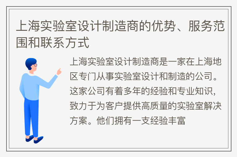 上海实验室设计制造商是一家在上海地区专门从事实验室设计和制造的公司。这家公司有着多年的经验和专业知识,致力于为客户提供高质量的实验室解决方案。他们拥有一支经验丰富......【点击详情】