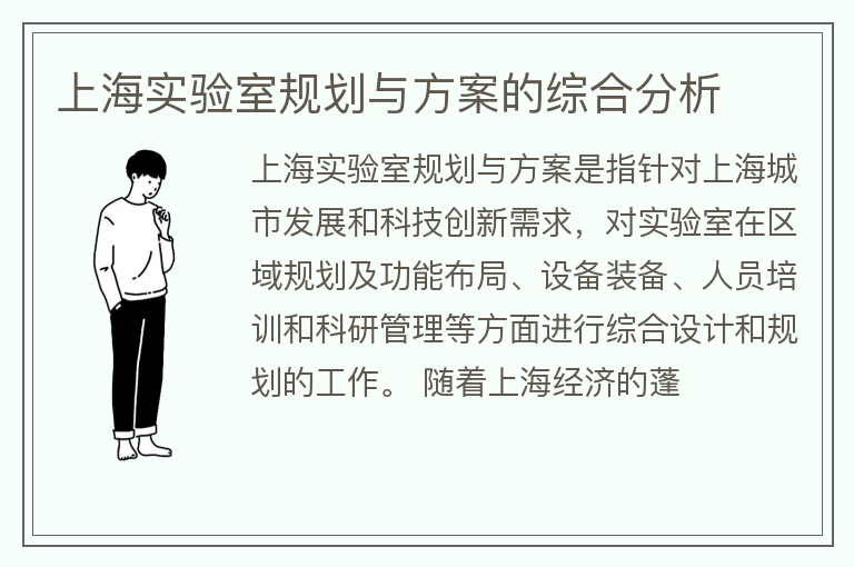 上海实验室规划与方案是指针对上海城市发展和科技创新需求,对实验室在区域规划及功能布局、设备装备、人员培训和科研管理等方面进行综合设计和规划的工作。 随着上海经济的蓬......【点击详情】