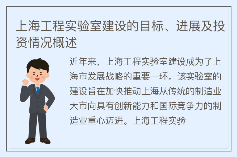 近年来,上海工程实验室建设成为了上海市发展战略的重要一环。该实验室的建设旨在加快推动上海从传统的制造业大市向具有创新能力和国际竞争力的制造业重心迈进。上海工程实验......【点击详情】