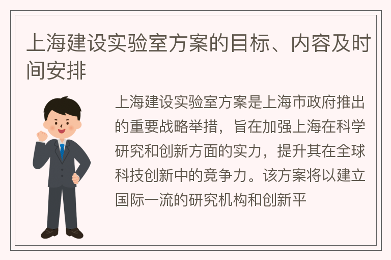 上海建设实验室方案是上海市政府推出的重要战略举措,旨在加强上海在科学研究和创新方面的实力,提升其在全球科技创新中的竞争力。该方案将以建立国际一流的研究机构和创新平......【点击详情】