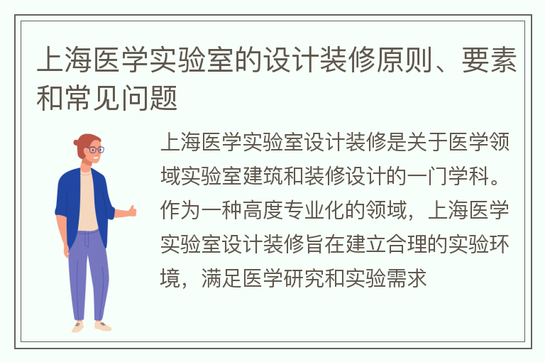 上海医学实验室设计装修是关于医学领域实验室建筑和装修设计的一门学科。作为一种高度专业化的领域,上海医学实验室设计装修旨在建立合理的实验环境,满足医学研究和实验需求......【点击详情】