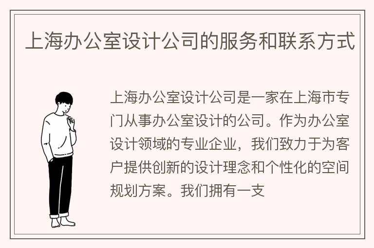 上海办公室设计公司是一家在上海市专门从事办公室设计的公司。作为办公室设计领域的专业企业,我们致力于为客户提供创新的设计理念和个性化的空间规划方案。我们拥有一支......【点击详情】