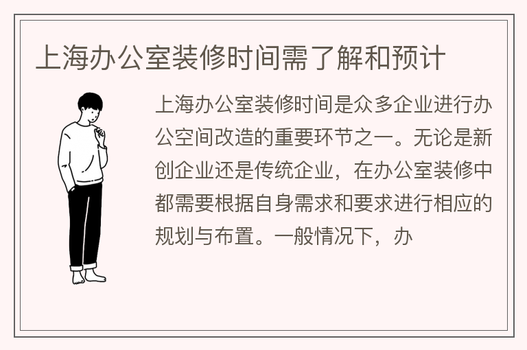 上海办公室装修时间是众多企业进行办公空间改造的重要环节之一。无论是新创企业还是传统企业,在办公室装修中都需要根据自身需求和要求进行相应的规划与布置。一般情况下,办......【点击详情】