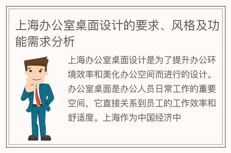 上海办公室桌面设计是为了提升办公环境效率和美化办公空间而进行的设计。办公室桌面是办公人员日常工作的重要空间,它直接关系到员工的工作效率和舒适度。上海作为中国经济中......【点击详情】