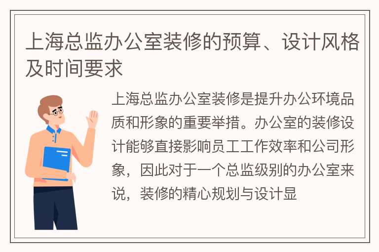 上海总监办公室装修是提升办公环境品质和形象的重要举措。办公室的装修设计能够直接影响员工工作效率和公司形象,因此对于一个总监级别的办公室来说,装修的精心规划与设计显......【点击详情】
