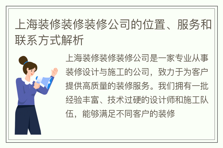 上海装修装修装修公司是一家专业从事装修设计与施工的公司,致力于为客户提供高质量的装修服务。我们拥有一批经验丰富、技术过硬的设计师和施工队伍,能够满足不同客户的装修......【点击详情】