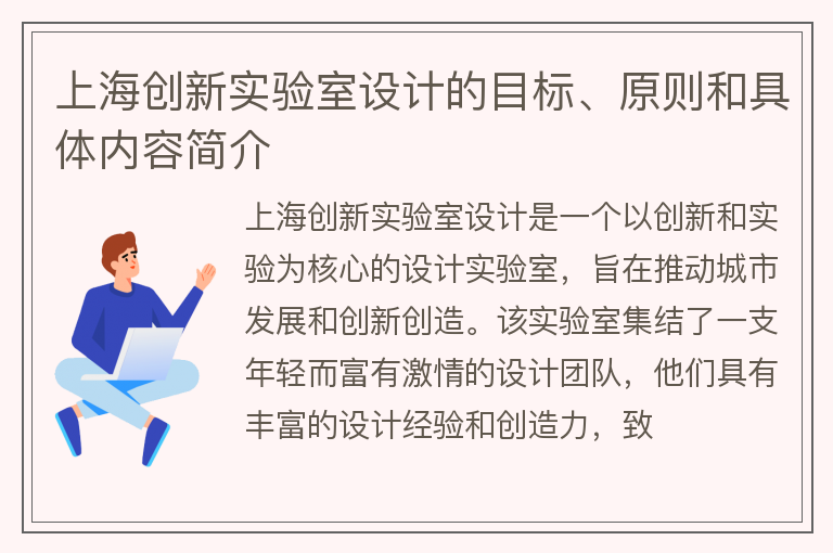 上海创新实验室设计是一个以创新和实验为核心的设计实验室,旨在推动城市发展和创新创造。该实验室集结了一支年轻而富有激情的设计团队,他们具有丰富的设计经验和创造力,致......【点击详情】