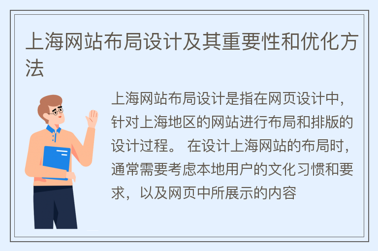 上海网站布局设计是指在网页设计中,针对上海地区的网站进行布局和排版的设计过程。 在设计上海网站的布局时,通常需要考虑本地用户的文化习惯和要求,以及网页中所展示的内容......【点击详情】